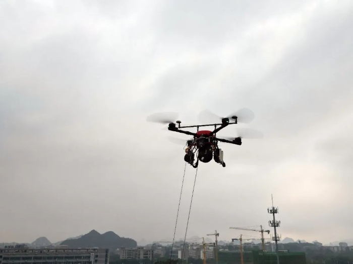 “我这边准备好了,可以起飞了!”一声令下,停放在相距数十公里的两端试验点上的系留无人机同时起飞,在驾驶员全神贯注地操作下,无人机缓缓升空,并平稳地悬停在上方数十米处。