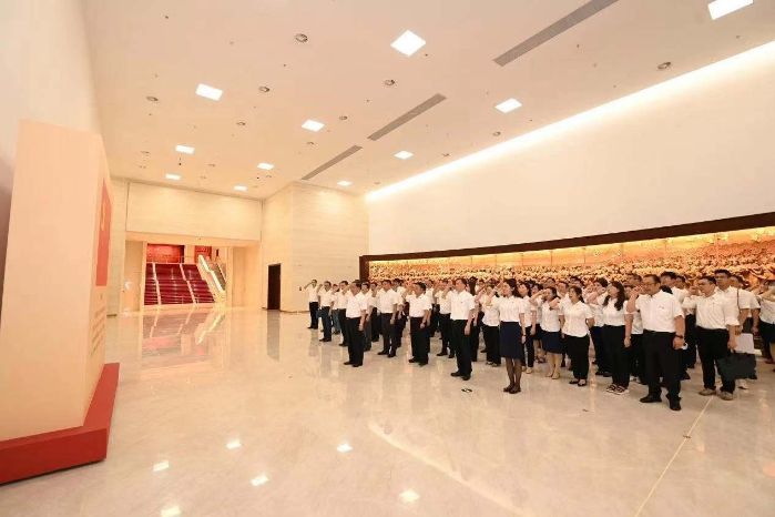 上午10时许,面向鲜红的中国共产党党旗,陈肇雄带领全体人员庄严宣誓,重温入党誓词,用铿锵有力的誓言表达对党的无限忠诚和为共产主义奋斗终身的坚定决心。
